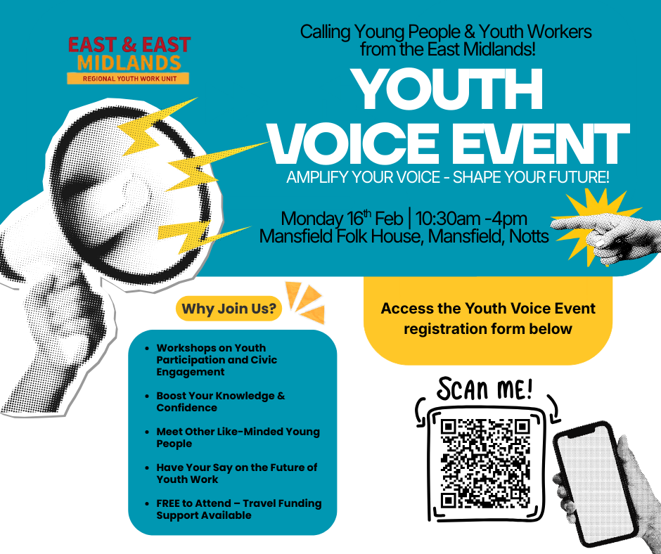 Calling young people and youth workers from the East Midlands – Youth Voice Event Amplify Your Voice – Shape your Future Monday 16 February 2026, 10.30 – 16.00, Mansfield Folk House, Mansfield See the photo on the News page for the workshop choices and to register